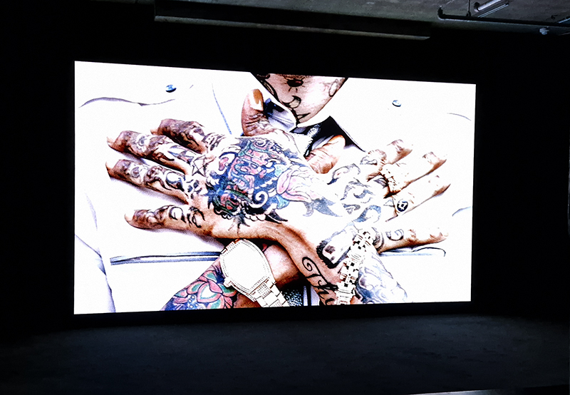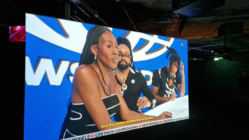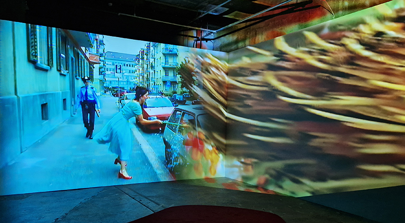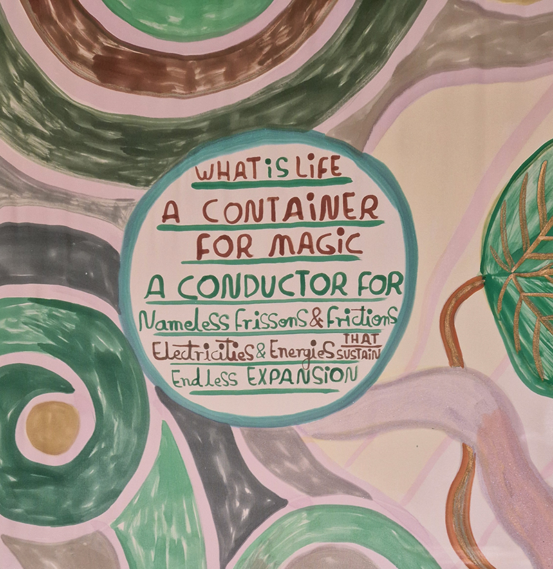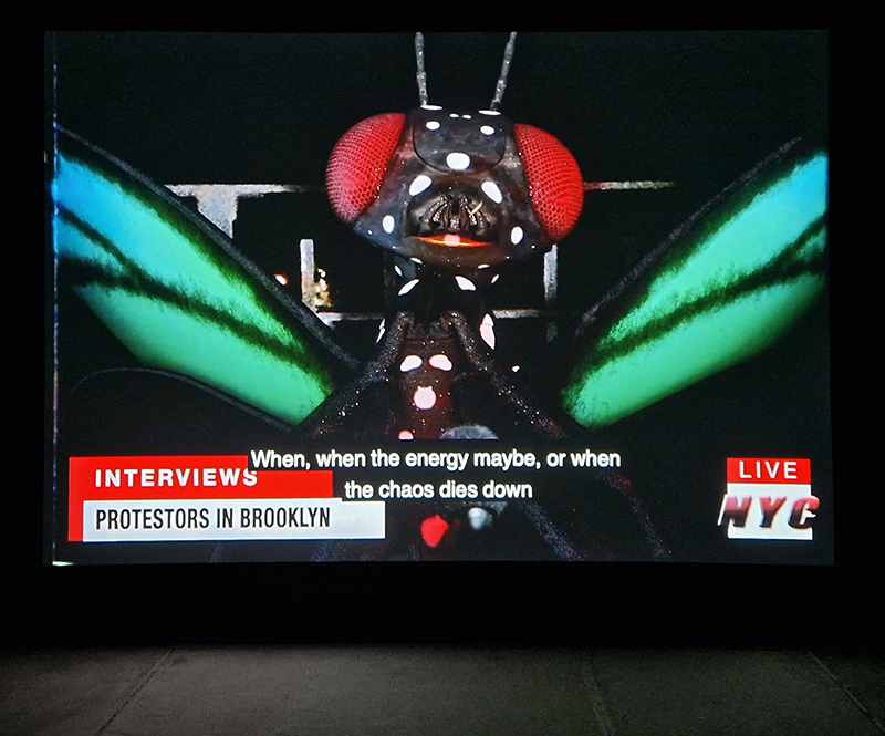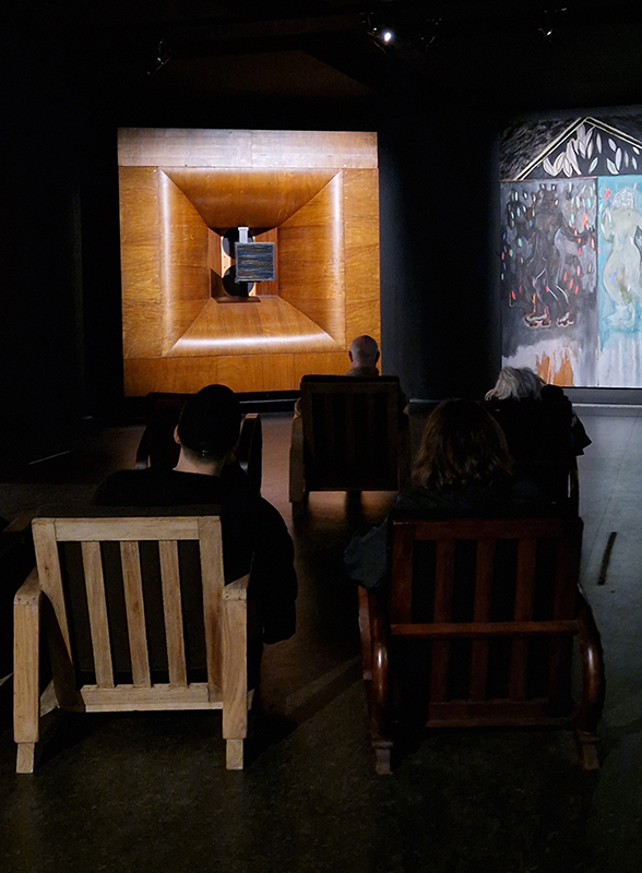 Noémie Goudal The Story of Fixity, an Artangel commission at Borough Yards. Three large screens layered with cut out shapes, that add a 3D staging to the film projections which cycle every 15 minutes through lush vegetation, whiting out to fading painted backdrops and water cascading in rivulets or vaporous spray and dark rocks. Water also drips from the ceiling pooling and staining large steel plates on the floor. The sound is layered like a deep forest. Haunting and beautifully captivating.