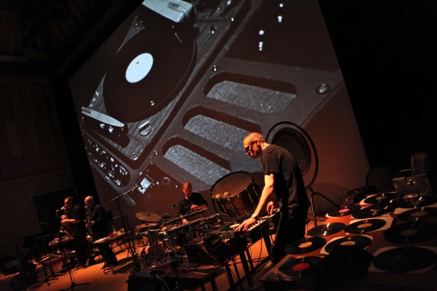 Christian Marclay took his signature splicing of film clips to create a visual stimuli for a group of musicians to overlay a soundtrack echoing the rhythms and emotions in the images. Like an improvised jazz session the musicians fed off each other as well as the film in a sustained assault on a climax which is never reached. The collage of images repeat an action stripped of its own narrative with the same action from many films until what might have been an insignificant moment becomes something portentous.