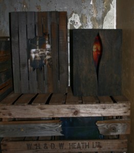 A terrible photo of this painting but it illustrates the echoing of the black arches in Dolly Thompsett’s painting with the arched architecture of the Crypt.