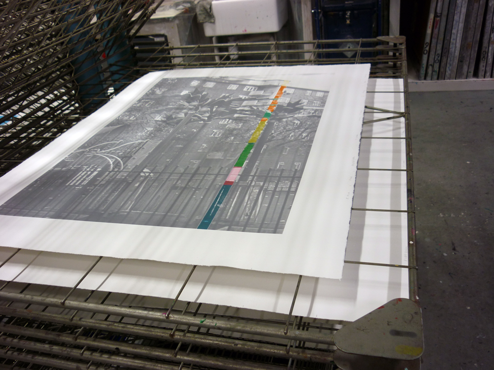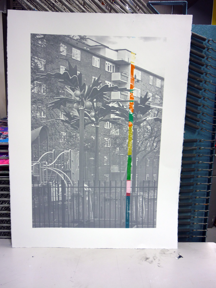 I printed grey straight onto white polyester leaving a blank strip for the colour sublimation print. Working with the polyester spray-mounted onto thin card to keep the image square I used the heat-press to add the strip of colour.