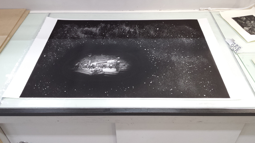 I have been working on the Paradise Forum piece as an etching. Etching is good for getting a really velvety black for the universe. It has been a real struggle to get the blend right between the photo etch and the aquatint. The problem of a dark or a light circle as one surface changes to another. I have learnt a lot about etching along the way.