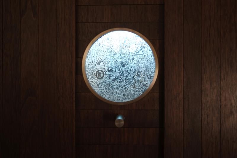 The circular peephole can be manually slid across the map revealing new zones and topographies. It is not a world view but a segmented journey across the land as through an ancient voyagers telescope.