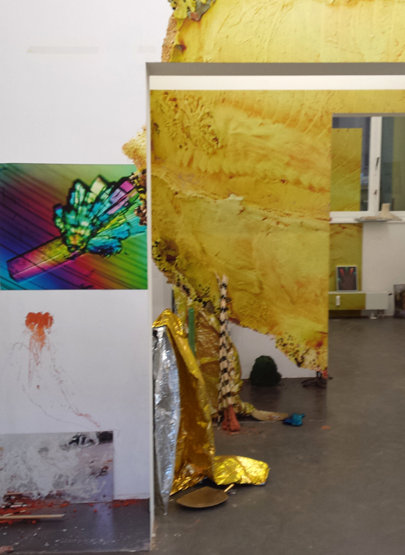 French artist Emmanuelle Laine at c-o-m-p-o-s-i-t-e gallery in Brussels had made a colourful intervention creating a sculpture on site that she then photographed and repeated around the gallery walls. She has found a way to include her research and incidental thoughts in her work, her tools both for process and inspiration are left scattered around the space in evidence