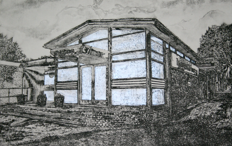 It is interesting how subtle shifts in the colour of paper and ink can change the atmosphere of an image. For the softground etching of the Chapel of Rest in Paradise Industrial Estate, Hemel Hempstead  I found a soft grey paper worked well with chine collé added over the windows. The grainy etching aged the building and using a lustre powder on the chine collé  reflecting opalescent when viewed at different angles gave the interior an other worldly aura that felt appropriate.