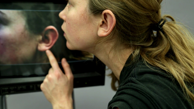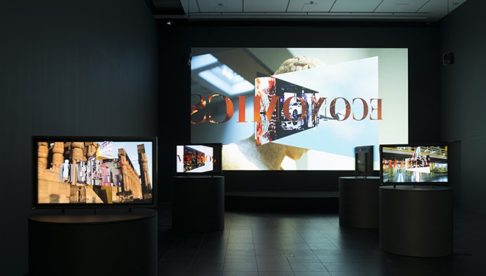 Within the dark space of the chapel lit by a faint glow from narrow stained glass windows a large screen takes the place of the altar. The sci-fi imagery in high saturation colour is dazzling in a perpetual cycle of abstracted motion, forming and reforming. There is a nice play between the deconstructed images of the stained glass – once this technology was awe inspiring in itself – and the similar breakdown of form in the swirling images on the screen. We are similarly held enthralled by this mesmerizing experience as were the first visitors to encounter the delights of light through coloured glass.