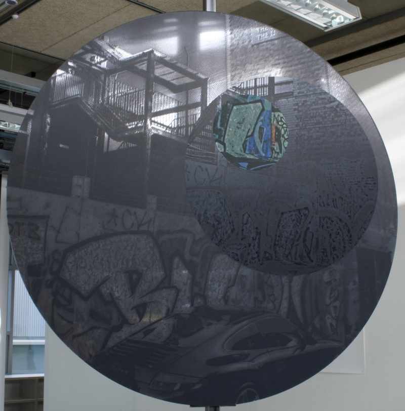 In this work I have taken the net which is used as the pattern to make a 3D dodecahedron when cut and folded into shape and used this as a structure meshing together images of constellations, an abandoned walled garden and a roundabout. I wanted to make connections between origins, structure, and belief systems. My original plan for this idea was to screenprint the images on individual segments of laser cut mdf – each piece would then be pulled slightly apart – the expanding universe. In the end it was a combination of time and feasibility that meant this idea was realised as a c-type print on metallic paper mounted on aluminium.