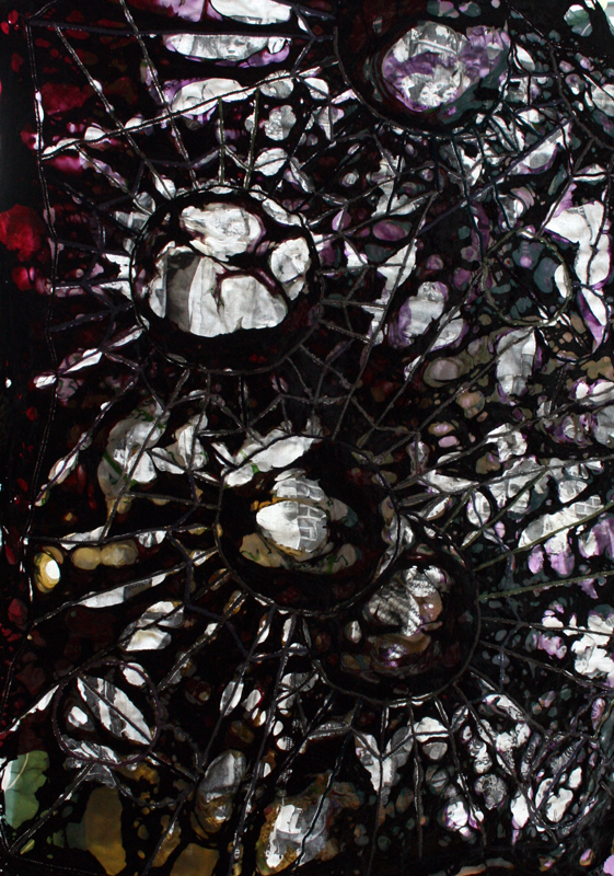 Here on these layered plastic carrier bags was the universe with digitally embroidered geometrical patterns of crystal structures.