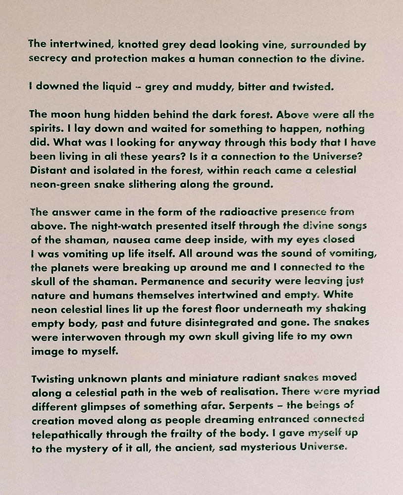 The poetry of the wall plaques was at odds with the clinical display of the photographs of medicinal plants of the rainforest. Two perspectives brought crashing together.