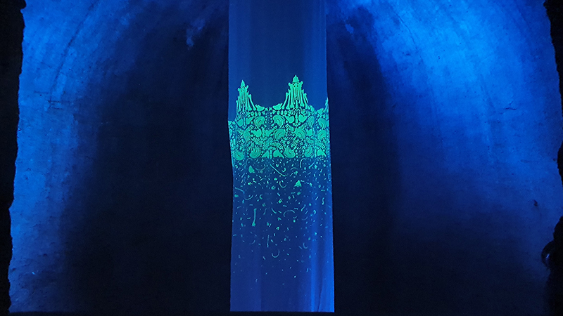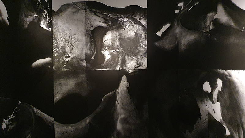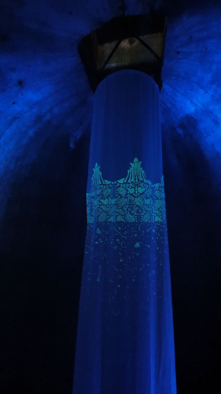 Took a trip to the Lake District to visit Brantwood, John Ruskin’s beautiful home to see Carol Wyss The Mind Has Mountains and Crown of Creation installations. Having seen the work that went into the printing of the large etchings at Thames-side Print Studio it was wonderful to be able to see the work finally installed and step inside the mysterious depths of the human skull; a space echoed by the surrounding mountains. The light installation is suspended in the dark chill of the Ice House vault, viewed from the top of rugged steps carved into the rock. Here the fragility of the human skeleton fades and glows accompanied by an evocative soundscape made by Natasha Lohan capturing the echoing chamber and the water that courses through everything.