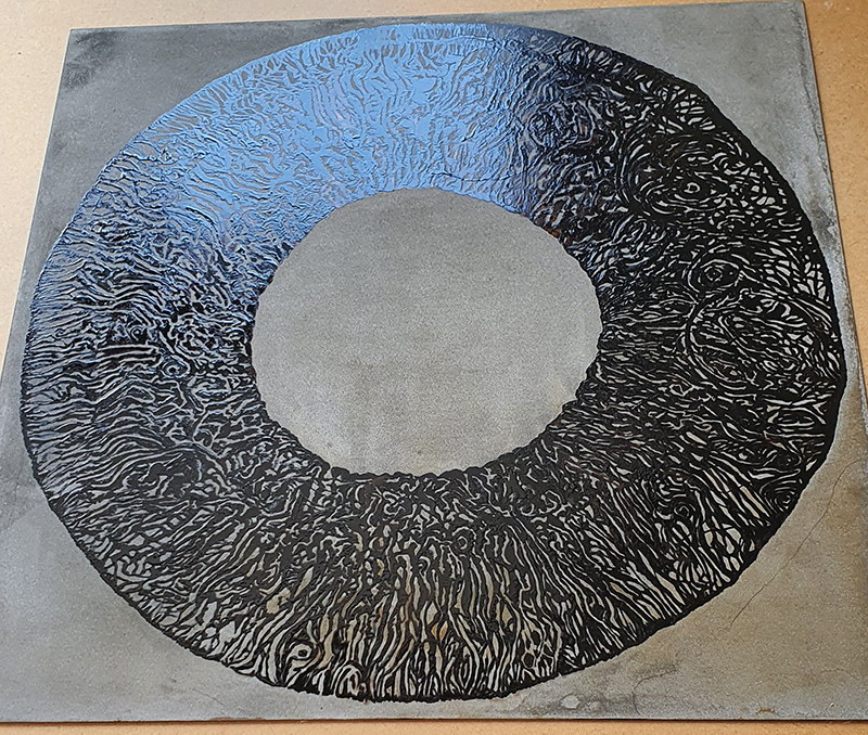 Work in progress on navigation by magnetic receptors. Working on a soft ground etching of my iris with aquatint. Not sure yet if I will use the plate or the print in the final work which will have iron filings activated across the surface.