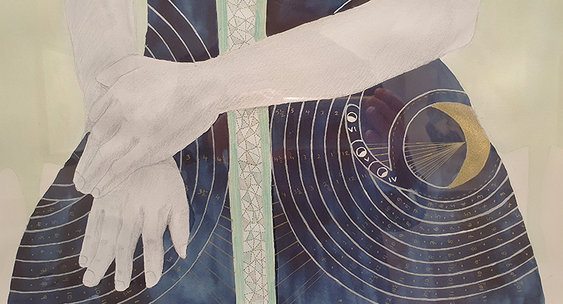 To provide a relevant backdrop for the online presentation I set my dodecahedron sculpture Diazôgraphô by the window to light up the images of cosmic particle trails within. The dodecahedron is used here as a motif for the universe. The title translates from Greek as ‘to embroider’. Plato described the dodecahedron as ‘a fifth construction, which the god used for embroidering the constellations on the whole heaven.’