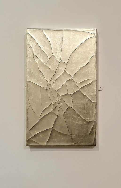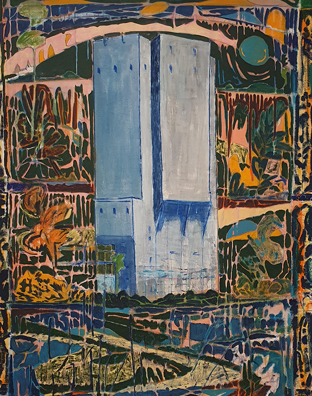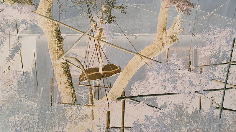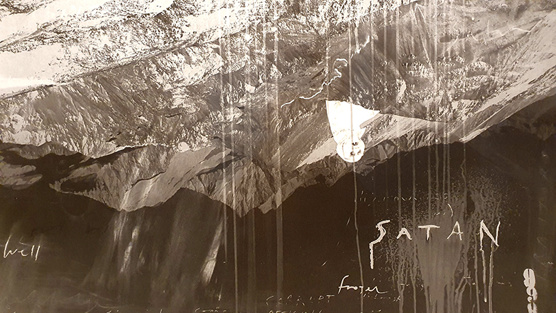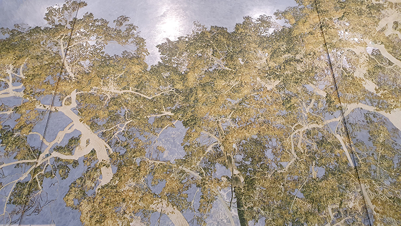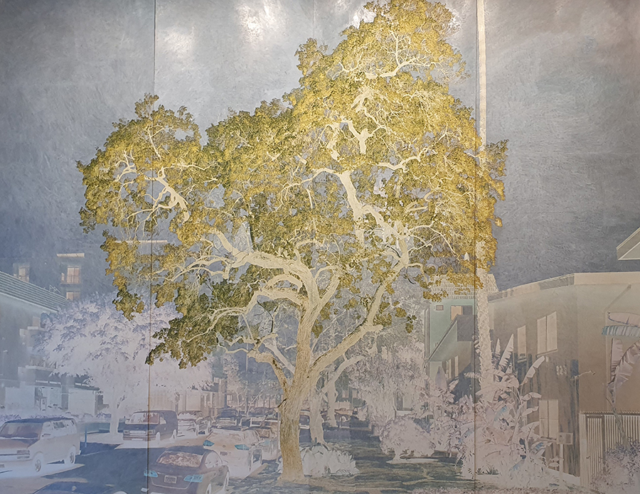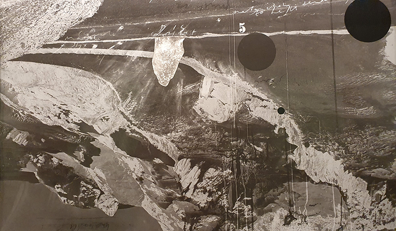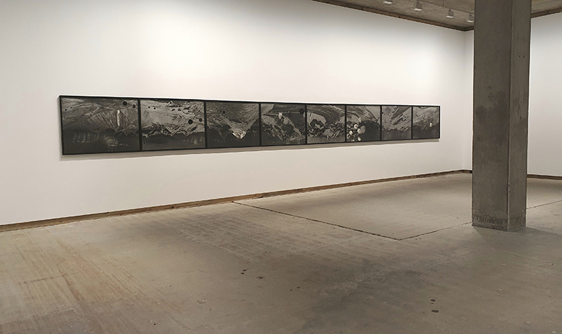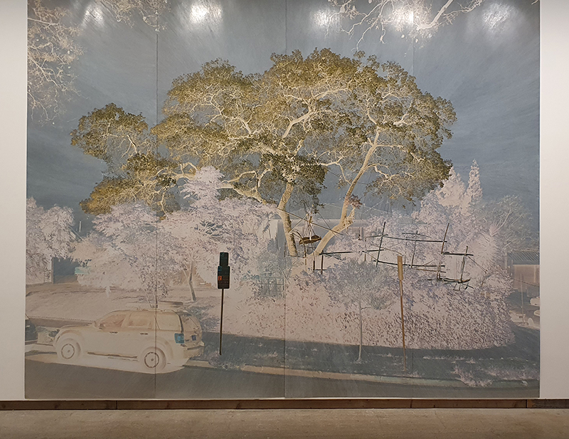 The large-scale photographs printed as negatives are of Jacaranda Trees which bloom in hot climates when the entire foliage turns into purple blossoms. In negative the purple becomes an otherworldly green and the background streetscape is muted with white pencil. The monochrome photogravures of an inverted mountainous terrain in negative using silver ink reference Botticelli’s drawings which signify Dante and Virgil’s descent through the nine circles of hell.