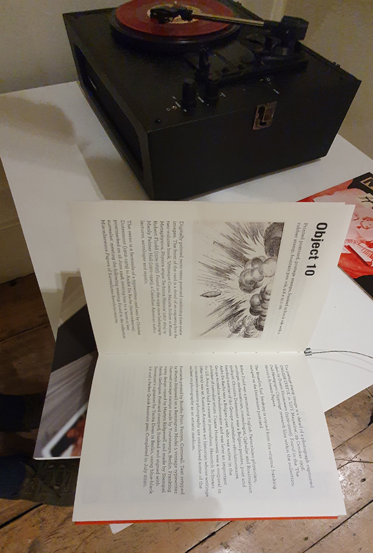 The importance of objective chance as a tool of research used as the basis to craft 50 objects inspired by the random choice of a box of artefacts at The Getty Research Centre, Los Angeles. The objects pertaining to ‘an exhibition in a box’ include ‘the forged signature of Christian Dotremont, a long-dead Belgian surrealist, on a postcard; a letterpress copy of Piet Mondrian’s carte de visite, hand-corrected by Dean to match a pencilled correction on the original; Fluxus artist George Brecht’s Stamp Out Stamping stamped on vintage index cards; a vinyl record of Dean reading a montage of text fragments collated from her working photocopies; and ‘a foot of feet’ – a foot-long strip of film made of sixteen frames of found images of feet. Object 1, is a small book which also acts as the key to the provenance and manufacture of the other 49 objects.’