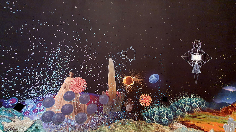 Alienarium 5 Dominique Gonzalez-Foerster at Serpentine Gallery. Managed to miss the seductive glimpse of The Closed Planet and any holograms but did experience the VR though connections promised with other alien beings failed to materialize – there were other forms floating in the distance but no way to communicate. I suppose this reinforced the difficulty of cross being communication. The reading list turned to cushions had become a toddler soft play area and while the 360 panorama was impressive in scale and content included it felt ‘educational’ as opposed to enlightening.