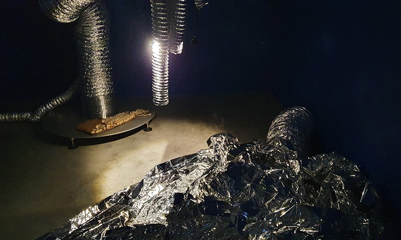 Jump ten years to Cold Light a collaboration with Keith Sargent at Matt’s Gallery in their new swanky location at Nine Elms. Subtle intervention has been sacrificed for the installation which is engaging on a different more immediate sensory level of flashing lights on shiny objects. The work is inspired by the futurist Nikola Tesla and his experiments with electricity in the early part of the 20th century. Cold light refers to light produced electrically rather than by fire. The use of low-fi silver foil and extractor vent tubing, along with scaffolding and clunky robotics give an impression of the home inventor. This would have looked futuristic in Tesla’s lifetime. I experienced the VR CGI environment, it was cold place emotionally despite the pigeons which were apparently Tesla’s true love. Is this the CGI future alluded to in past work?