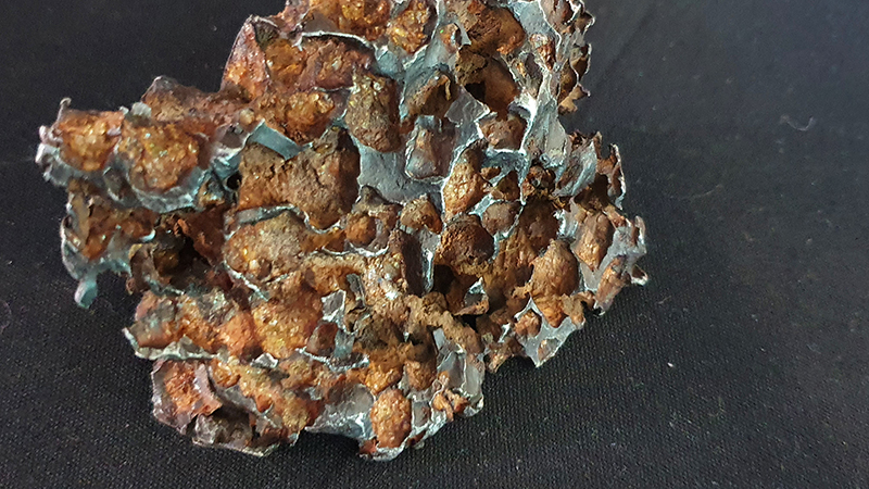 An attempt with copper sulphate again on a larger piece this time wasn’t quite so clean as before although the structure is visible. I am wondering if there is a better side to etch – both sides look the same but maybe there is a difference in how deep the structure is hidden.