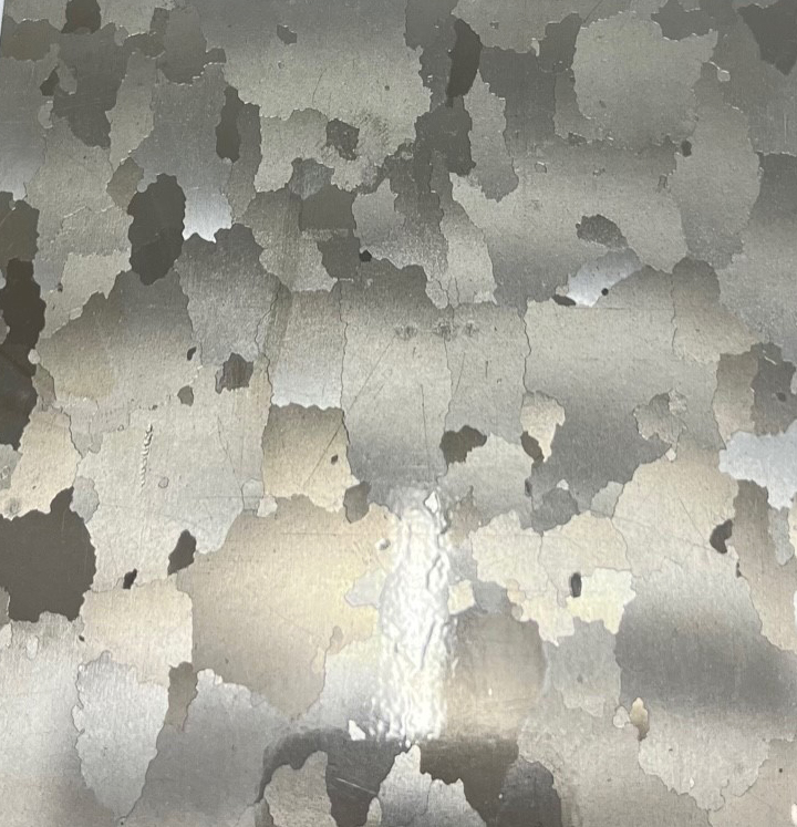 Exciting developments in the acid room etching the directional magnetic steel sample I have been given. Trying to uncover the grain structure like a jigsaw pattern of this magical matter hidden under a grey coating. I had no luck trying to reveal the pattern just by sanding. I then tried sanding the coating away quite aggressively and etching in 1:4 nitric acid for 10 minutes. This did reveal the hidden structure but not very cleanly and weirdly sanding or polishing after etching made the pattern disappear again.