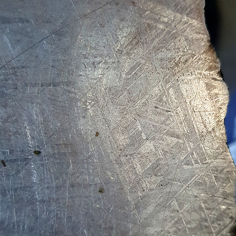 I was informed that this texture was made visible by etching the meteorite in hydrofluoric acid though it may also need polishing. This made me hopeful to reveal the hidden structure of the directional magnetic steel sample (image right) provided to me by Union Steel Products which is currently hidden by an opaque grey coating over a thin layer of smooth steel. I first saw this type of extra magnetic steel at the National Physical Laboratory open day. It is no longer manufactured in the UK and so am grateful for the sample.