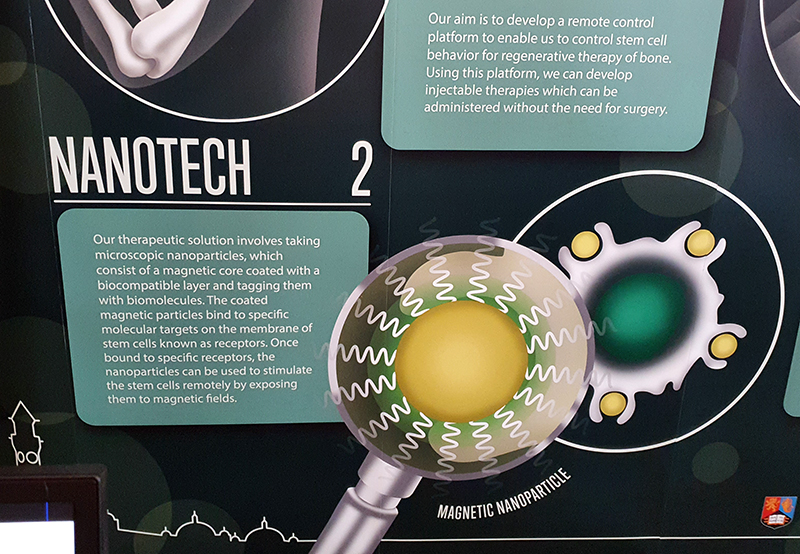 Magnetic nanoparticles exhibit superparamagnetism, meaning that these tiny magnetic particles flip magnetic orientation between north and south rapidly at random appearing to be non-magnetic unless subjected to a magnetic field. When a magnetic field is applied, the particles’ ‘north’ and ‘south’ align with the field direction, turning the nanoparticles’ magnetic properties ‘on’. By binding these nanoparticles to stem cells and injecting them into the body they can be directed to the target injury site using a controlled magnetic field outside the body. Once at the injury site the magnetic force can be turned on and off to stimulate the cells controlling cell behaviour and biological pathways speeding up the healing process.