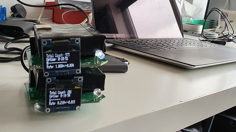 Testing testing. Running the cosmic ray detectors at my studio to see if I get similar results to at home and yes, seems fairly consistent. Maybe slightly more hits. Thinner roof!