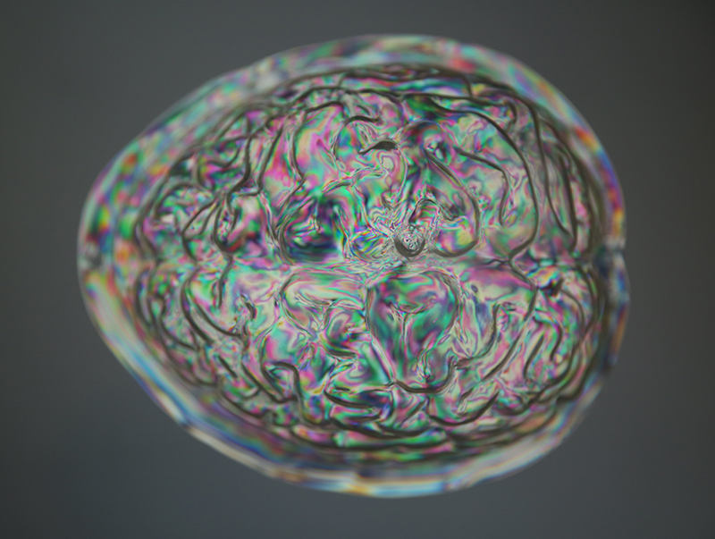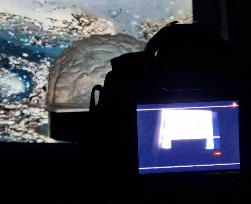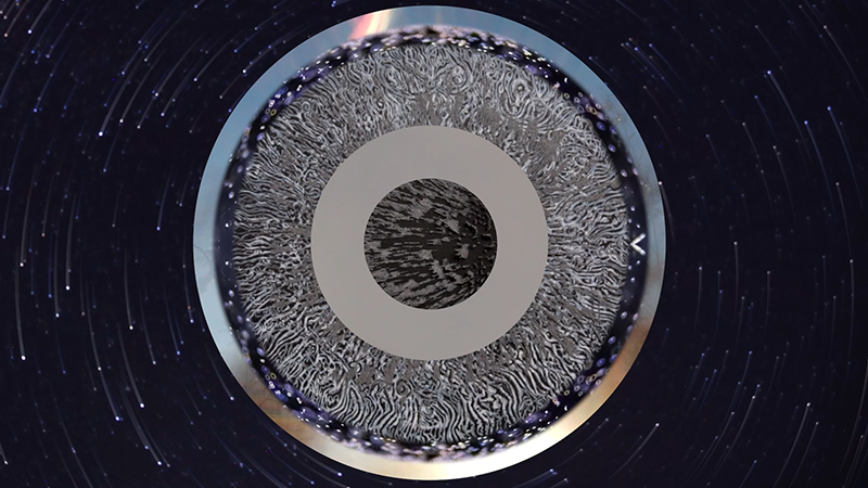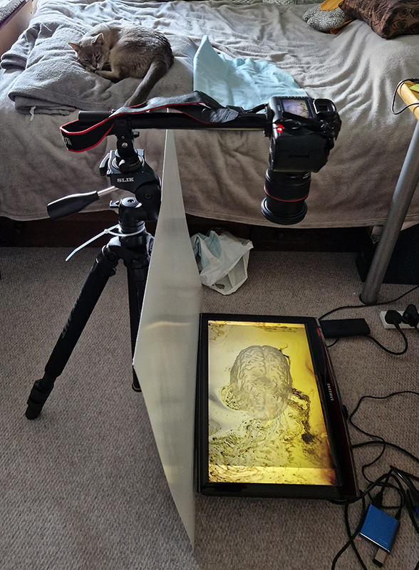If you place a polarising filter over a screen that emits polarised light and use a polarising lens on the camera, then any plastic, photographed in this method, especially injection-moulded plastic, reveals stress points with a kaleidoscope of colours known as birefringence. Cryptochrome, the protein molecule found in a birds eye that enables birds to ‘see’ the magnetic field is excited by polarised light. Polarisation may also reveal the existence and properties of magnetic fields in the space medium light has travelled through. Research suggests that human alpha brainwaves react to a changing magnetic field. These ideas are brought together in a video work speculating on human magnetoreception via magnetite crystals in brain cells.