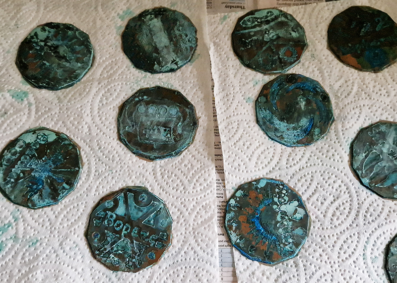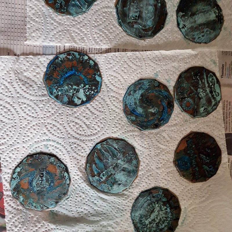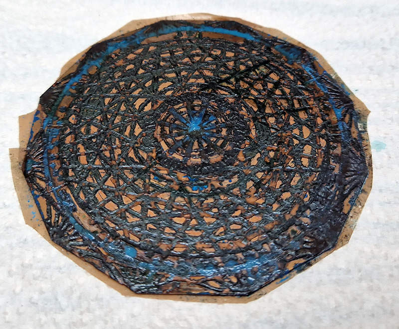 These were etched for 2 hours in an Edinburgh Etch solution, made with ferric chloride, citric acid and water to get a deep etch. The detail in the bitumen held very well. I constructed a collagraph from card to attach them to for casting in concrete. Once etched the detail areas were painted with a soy sauce solution before being placed in an ammonia vapour bath.