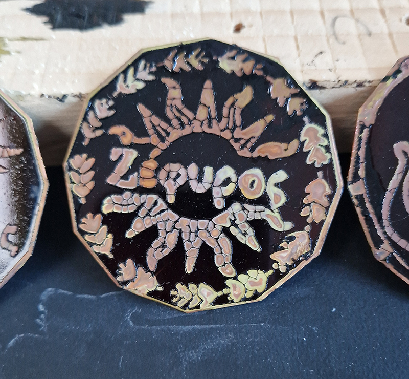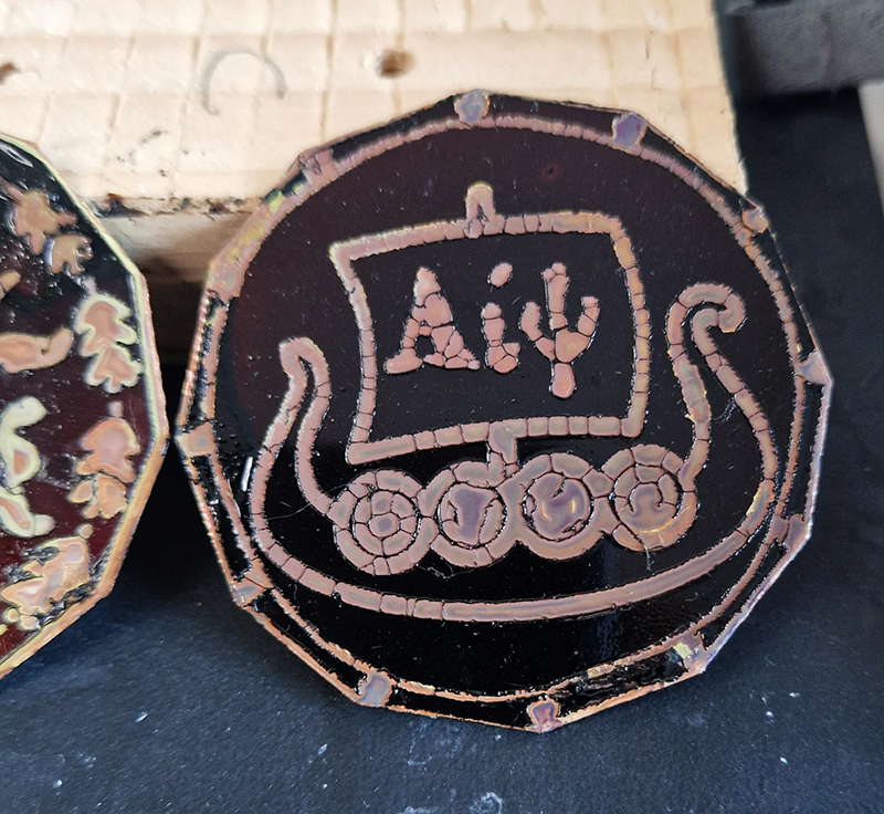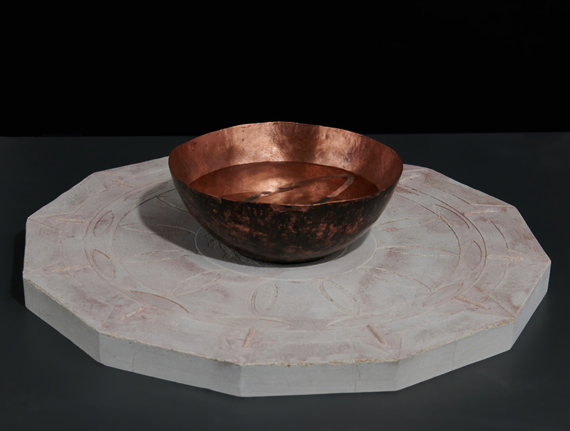 This is the third of the tablets to be cast for the work Instruments of the Anemoi. The first holds a copper bowl with a ‘silver fish’ floating in water based on the oval shaped compass needle (illustrated in Breve Compendio de la Sphera de la arte Navegar by Martin Cortes 1551) as symbol of the silver fish – wafer thin fish shaped iron leaves used by 11th century Chinese geomancers.