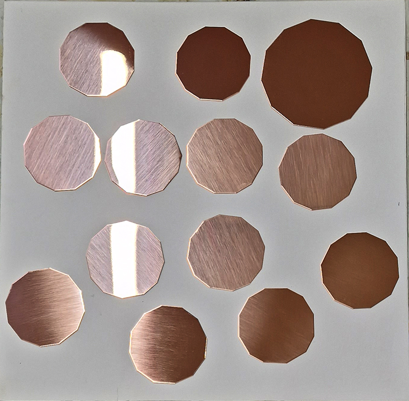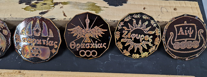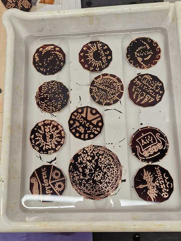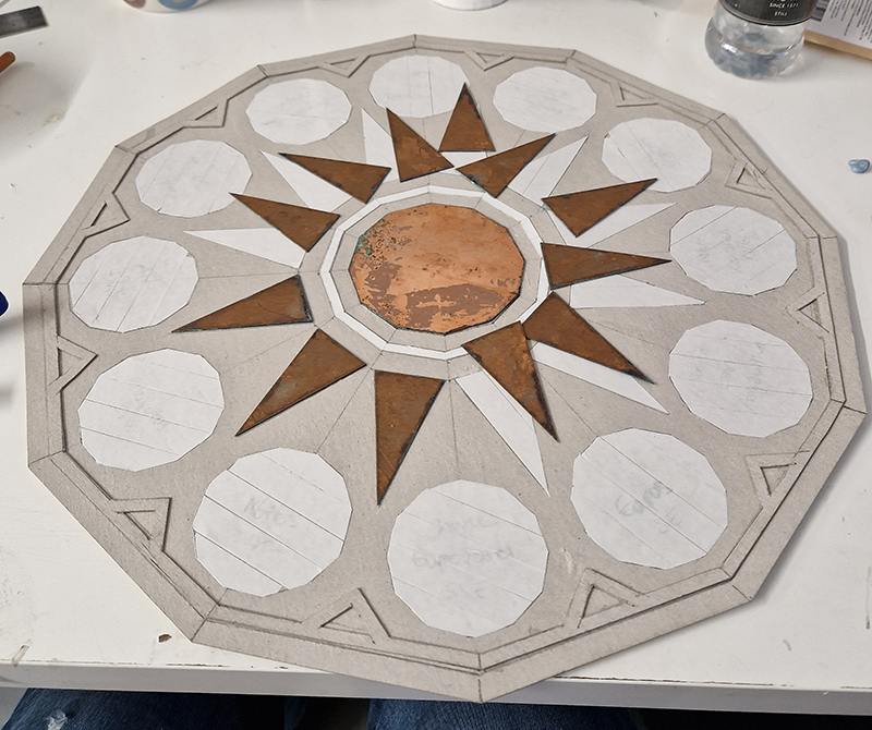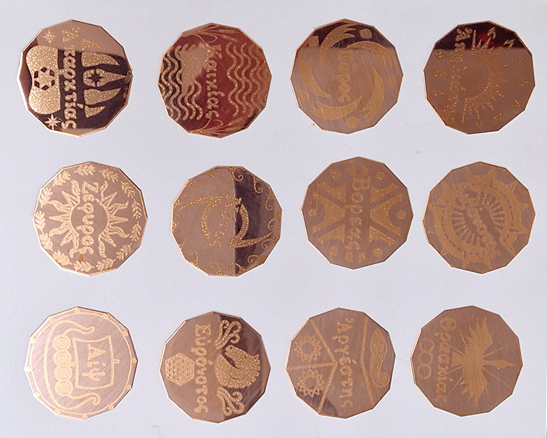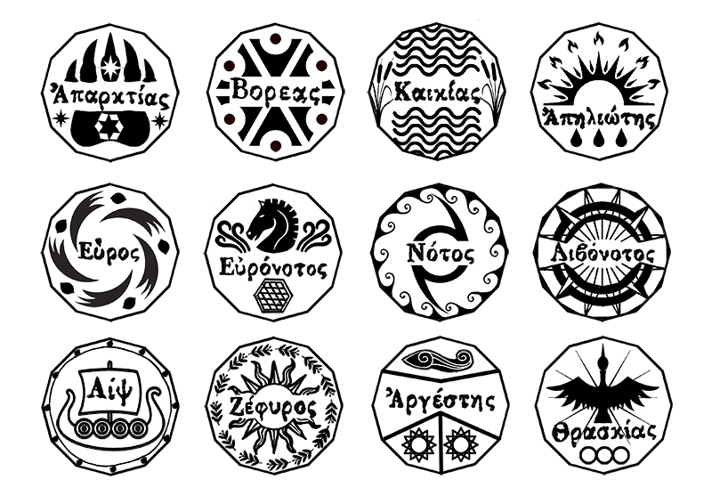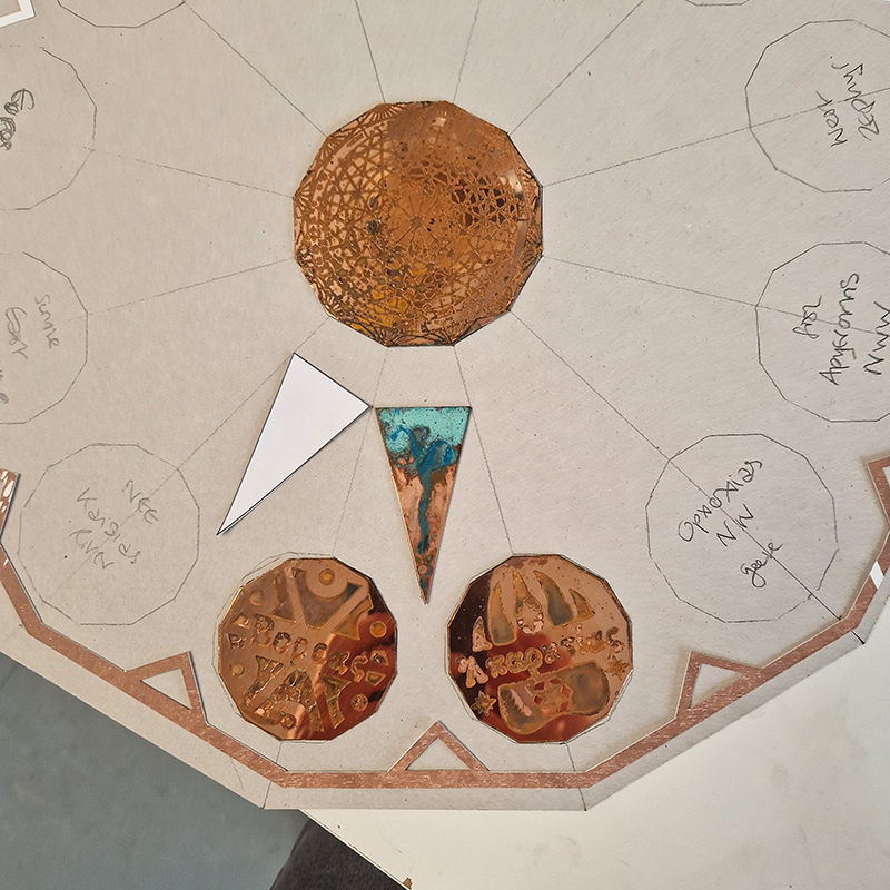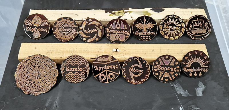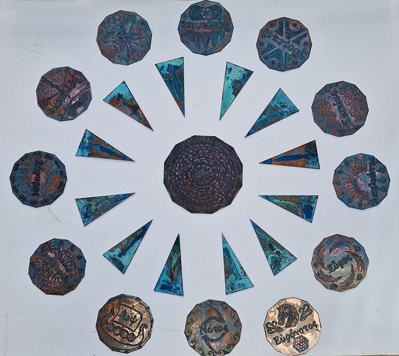 Hand cut copper pieces to be etched with images based on associations and attributes of the twelve Greek wind gods.