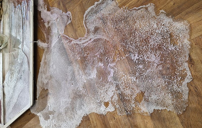 Positions are marked out on the collagraph and double sided tape is used to secure the pieces in place face down. The collagraph is then placed in the silicon mould ready for casting with Snowcrete – the same non-magnetic concrete used at a magnetic observatory.