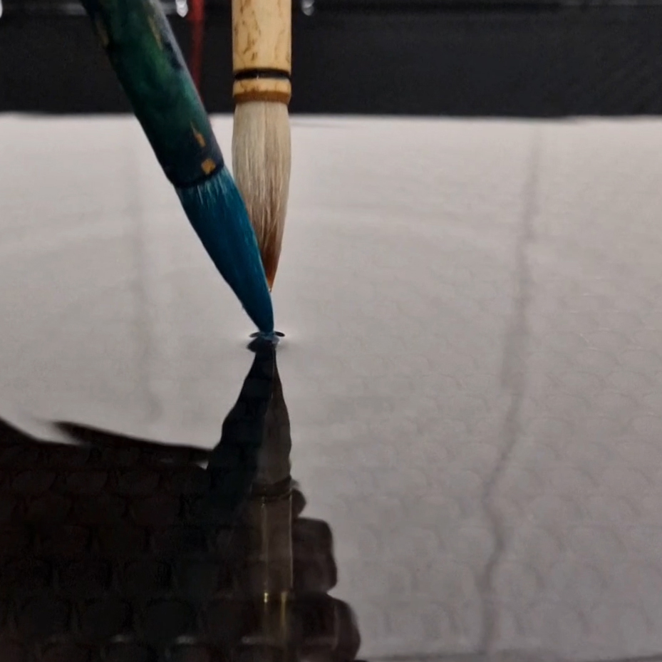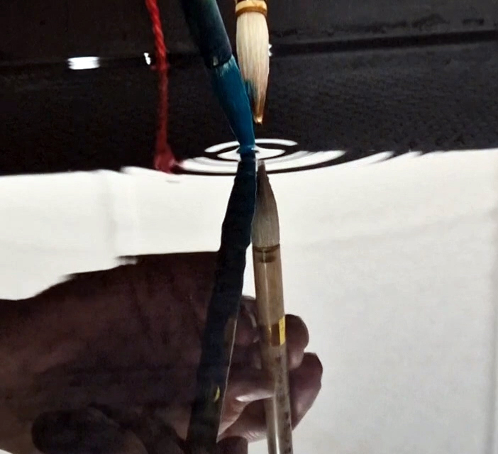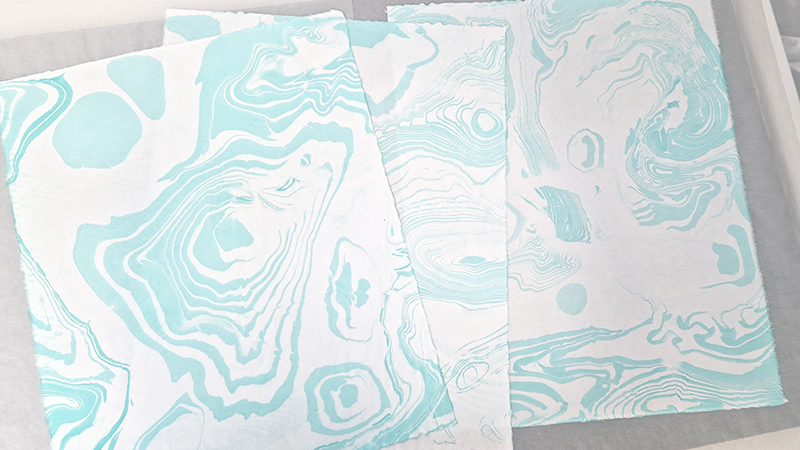 The 48 paper tiles for the roof of The Absolute Hut (of action potential) are made using the suminagashi technique of marbling with a colour to reflect both the sky and the patinated copper roof tiles of the Observation Hut at Hartland Magnetic Observatory. The paper is Japanese Osho Select and is very fragile when wet so has to be pulled from the water tray using a supporting mesh. Topological contours of suminagashi marbling reflect the fluid motion of the Earth’s magnetic dynamo and the pulsating alpha waves of the human brain when subjected to magnetic fields.