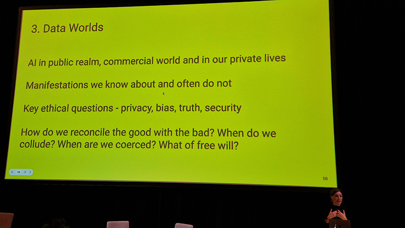 The Future Now Symposium threw up some interesting and potentially disturbing questions about AI despite some speakers such as Dr Suzanne Livingston and Marian Ursu, positive spin that AI could herald a new utopia of knowledge production and collaboration to solve the world’s problems. The panel discussing ‘The Impact of New Technologies’ were all in agreement that it is already too late to change or avert the learning bias of AI systems reflecting and perpetuating human biases, as the early modelling is embedded too deep in systems that no one really understands or can control. There was encouragement to welcome the new technologies such as chatGTP and text prompt generative fill software as new tools to be used to expand on what we can create rather than seeing these as taking over the creative thought process.