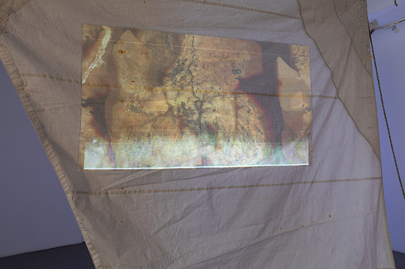 In 2019 Caroline AreskogJones spent time on the Sea of Hebrides making a series of responses whilst researching more viscerally the ocean as a site of ‘field research’ and gathering recordings. ‘Sounding Line’ (2024, sail, audio/video single channel as projection 07:32 min. Sail courtesy of Sail Britain) was created in deliberate wave format being inspired by Jean Painleve, whose hybrid films overlaid with jazz soundtracks occupy the uncertain space between art and science. Oskar Jones was invited to create the sonic composition in response – the saxophone being a wind instrument of extraordinary virtuosity. Since 2023 Caroline has been visiting the Natural History Museum Cetacean Archive – at the invitation of Principal Curator, Richard Sabin. Through conversations including those with environmental historian Sophia Nicolov, her research has broadened and this updated presentation includes recordings of the two remaining Orcas who inhabit the Sea of Hebrides courtesy of the Hebridean Whale and Dolphin Trust.
