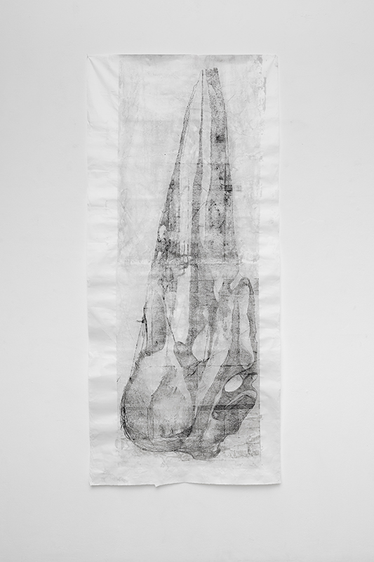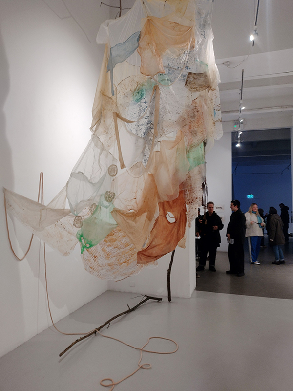 Fragility and vulnerability are embodied in layered works on paper, a large suspended sculpture made from delicate compostable material and living installations incorporating transient elements that transform over the exhibition period.