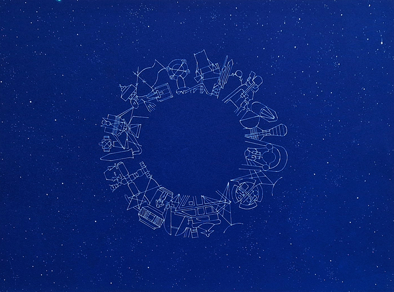 The gallery location in Deptford, once a major departure point for maritime trade and scientific expeditions from Deptford Dockyard, resonates with the exhibition’s concept of being ‘at sea’, in the sense of negotiating the unknown. It was Deptford Dockyard that Edmund Halley set sail from to make the first circumnavigation of the Earth to map the declination of the magnetic field. The ship that he captained, the Paramour, was the first vessel built specifically as a research vessel and launched in April 1694.