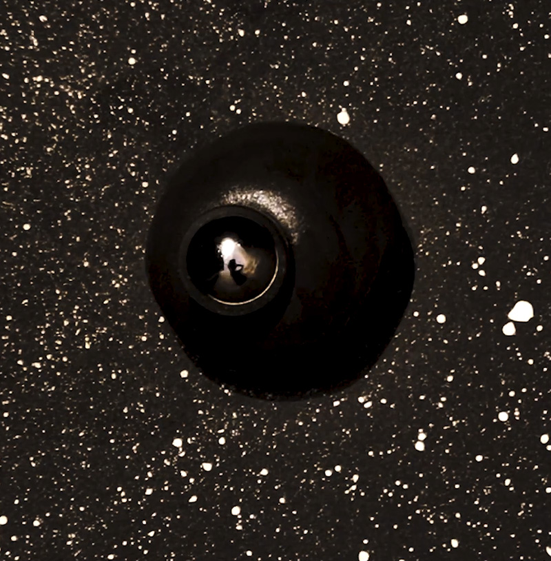 Speculating on a view of the world projected from the perspective of the rock. In the studio drilling more holes for optical lenses set out in a pattern based on the crystal structure of the naturally magnetic mineral magnetite which was determined in 1915 as one of the first crystal structures to be obtained using X-ray diffraction. Found in igneous rocks, sedimentary deposits and sand across the globe in many locations, magnetite is also found in the cells of organisms from bacteria to humans. Magnetite contains both ferrous (divalent) and ferric (trivalent) iron along with oxygen.