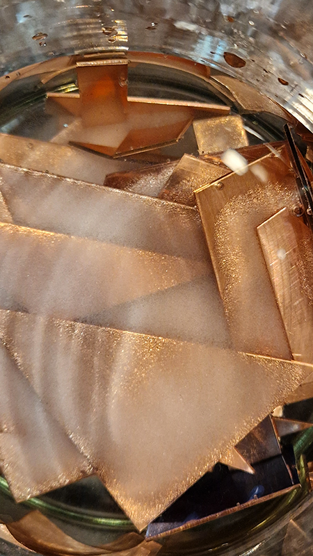 I began the magical process of making copper ink. Soaking pieces of copper in vinegar and salt, stirring daily and watching the liquid turn a milky turquoise blue. Looking forward to using this to patinate copper but also to paint with on paper.