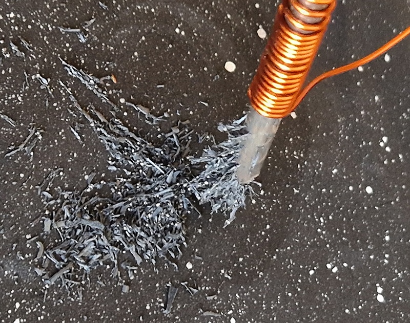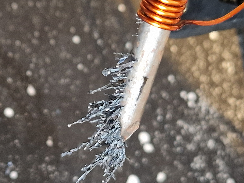 Experimenting winding a copper wire around an iron nail and connecting the wire to a battery cell. A magnetic field is generated around the nail which stays for a little while after the nail is removed from the coil. I used a 9v battery and large nail– it wasn’t a very strong magnet – a welding stick was better and seemed to retain the magnetic field for longer but in both cases the battery got very hot. I had hoped to maybe develop this idea to magnetise a sculpture threaded with iron. Needs more investigation.