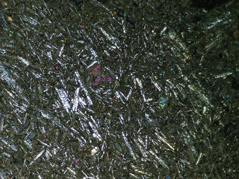 This slice of Olivine Basalt comes from Þingvallavatn, a rift valley lake in southwestern Iceland. The area is covered by lava. The cracks and faults around the lake is where the Eurasian and North American tectonic plates meet. This may be the only place where one can stand with two feet on two different tectonic plates. The sample is a mid oceanic ridge basalt (MORB) fine grained but consisting of small olivine, clinopyroxene fragments in ground mass dominated by plagioclase laths, an opaque magnetite.