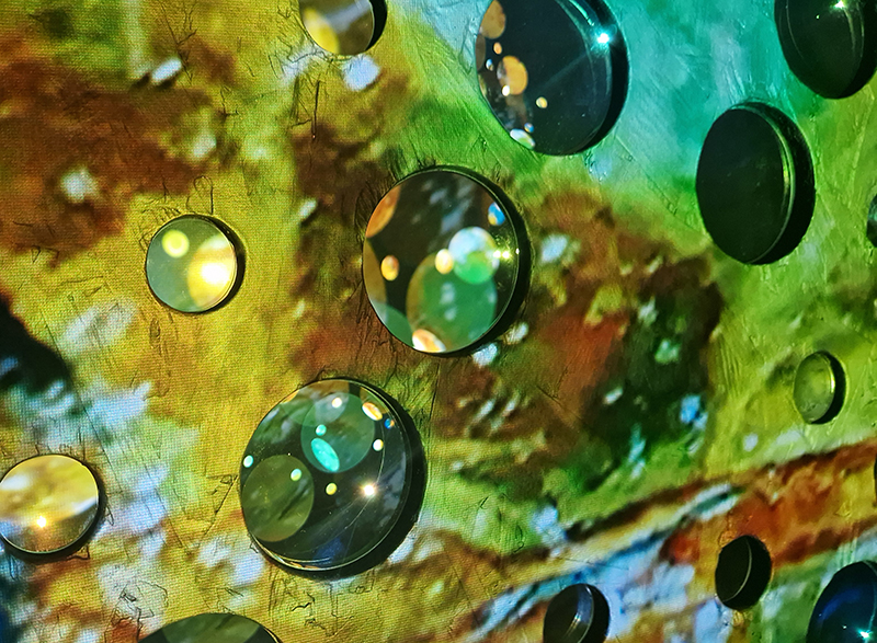 Investigating human/mineral entanglements for new work to be installed at Hypha HQ for The Geological Unconscious. Video of human activity projected through distorting optical lenses transforms the anthropocentric position to imagine the perspective of the rock. The pattern of lenses is informed by the molecular structure of magnetite,