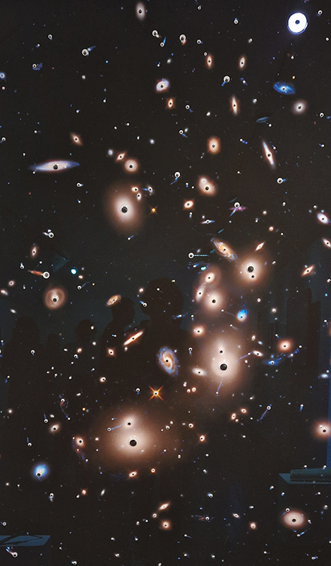 Julie F Hill’s large-scale sculptural print installation Parent Body, uses scanning electron microscope imagery of samples recently returned from asteroid Bennu. The data features detail of carbon-rich and organic ‘nano-globules’ which have been theorised as ‘proto-cells’. The sculpture evokes astro-geological-biological material lineages across deep space and cosmological time. In a contrast of scale, Julie is also showing Return, 3d print of asteroid Itokawa cast in plaster-of-paris with a bead of Iridium. Iridium is an rare-earth element more abundant in asteroids than the Earth’s crust. This miniature work considers the cross exchanges between space and earth and in a gesture of reverse sample return (scientific missions and human extractive processes both take), a bead of Iridium is returned to the belly of asteroid Itokawa.
