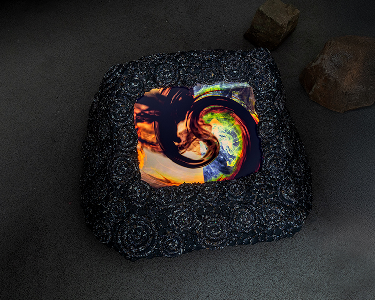Also showing the video sculpture Belly of a Rock – describing an imagined place of chemical conversations at the intersection of the animate and inanimate. Under a crusted shell, surfaces slide and scrape along lines of fissure, distended innards ooze and rocks moan as they are distorted by untold pressure. The turbulent spiralling of the molten core births rock and lifeforms which are acted upon by the drag of an oscillating magnetic field.