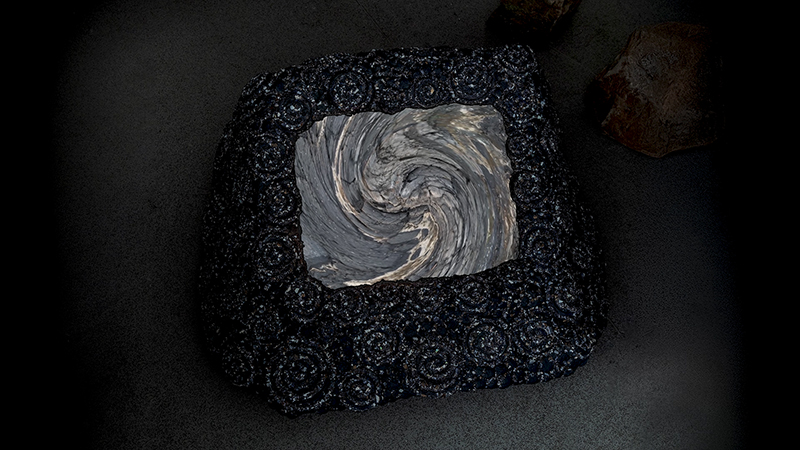 Tucked into a dark recess of the gallery, Belly of a Rock suggests an imagined place of chemical conversations at the intersection of the organic and inorganic. A hybrid between rock, mollusc and technology this video sculpture responds to an early lifeform’s emerging self-awareness, desire to communicate and urge to create as described by Italo Calvino in his story ‘The Spiral’. We don’t always know what we are creating.