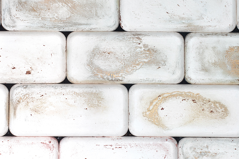 The sculptures presented by Charlie Franklin, Landform and FRAGS, are lumpy, solid looking forms that speak of geological debris or ruins. All three pieces were soaked in the waters of the North Sea, on the easterly edge of the UK. This process allowed the natural elements to determine their individual patination or colouring, along with indentations and scuffs, where materials have been worn away by salt and stone. Cave Drawings (Aladdin’s Cave, Series of Grottos, Marble Curtain, Fairy Grotto, and Solomon’s Temple) are a series of five found postcards depicting the caves at Cheddar Gorge in Somerset, UK which have been hand coloured by the artist. Franklin is interested in how the addition of colour can provoke a personality or aura within each cave interior, allowing for grand experiments to be realised on an intimate scale.