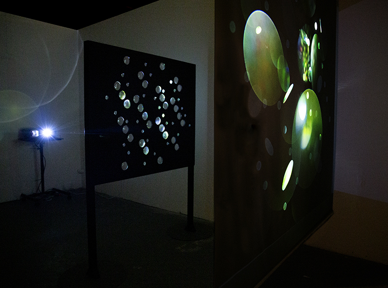 Very happy to receive lots of positive feedback for my video installation Lithos Panoptes. People were very engaged with how the work reveals itself in stages, from the kaleidoscopic imagery displaying on the two way suspended screen to discovering the board of distorting lenses behind the screen and finally stepping back to see the original film from the human perspective before it is transformed by the lenses.