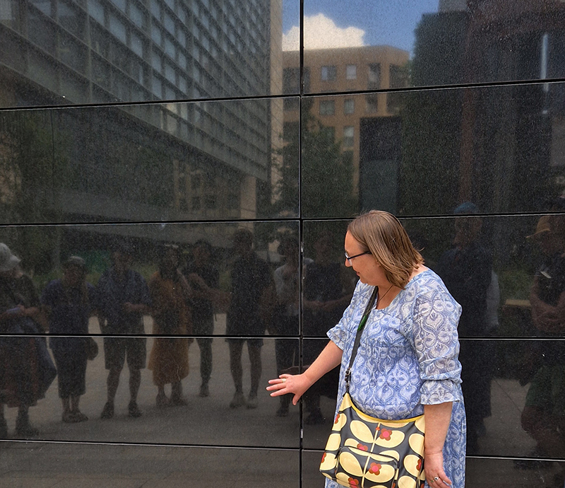 Ruth lead a group walk to explore the geology of the local built environment around Regent’s Place and Fitzrovia. Her knowledge of geology is astounding and her passion for stone infectious. Everyone came away incredulous, having their eyes opened to the deep time history of the rocks that build our city. The deep, black, Archaean dolerite from Mashonaland in Zimbabwe that Ruth points to is 2.2 billion years old. The large block of polished stone shaped like a giant pebble, itself crammed with pebbles of other rocks, is a sculpture by John Aiken, Monolith & Shadow. A patchwork of Jurassic limestone from southern Spain is crowded with the spire-shaped fossil shells of the gastropod Nerinea, stained red and yellow with ochres.