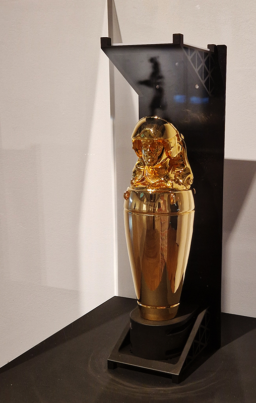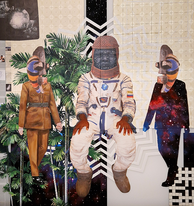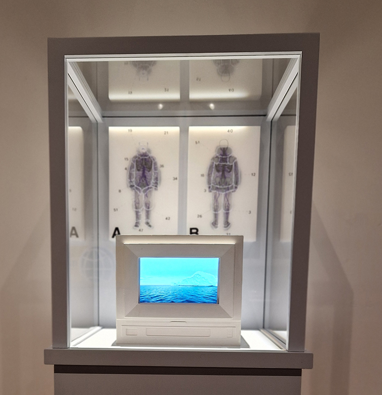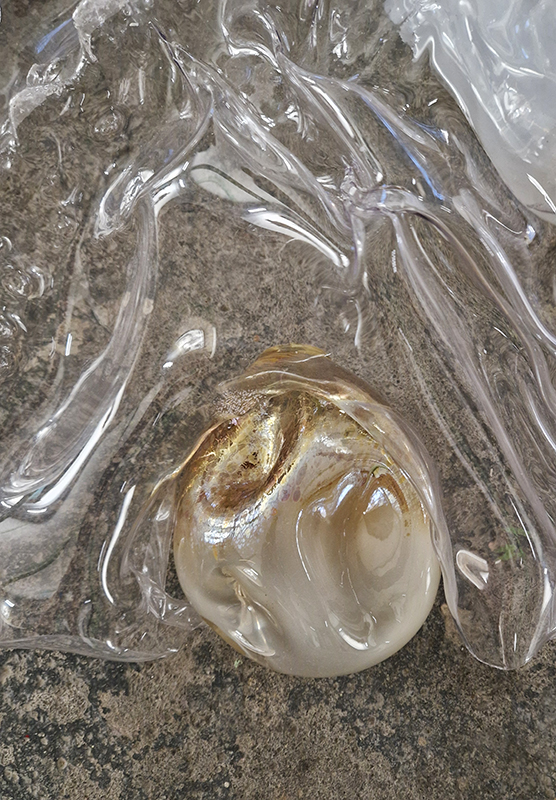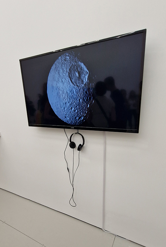Julie F Hill’s large-scale sculptural print installation Parent Body, uses scanning electron microscope imagery of samples recently returned from asteroid Bennu. The data features detail of carbon-rich and organic ‘nano-globules’ which have been theorised as ‘proto-cells’. The sculpture evokes astro-geological-biological material lineages across deep space and cosmological time. In a contrast of scale, Julie is also showing Return, 3d print of asteroid Itokawa cast in plaster-of-paris with a bead of Iridium. Iridium is an rare-earth element more abundant in asteroids than the Earth’s crust. This miniature work considers the cross exchanges between space and earth and in a gesture of reverse sample return (scientific missions and human extractive processes both take), a bead of Iridium is returned to the belly of asteroid Itokawa.