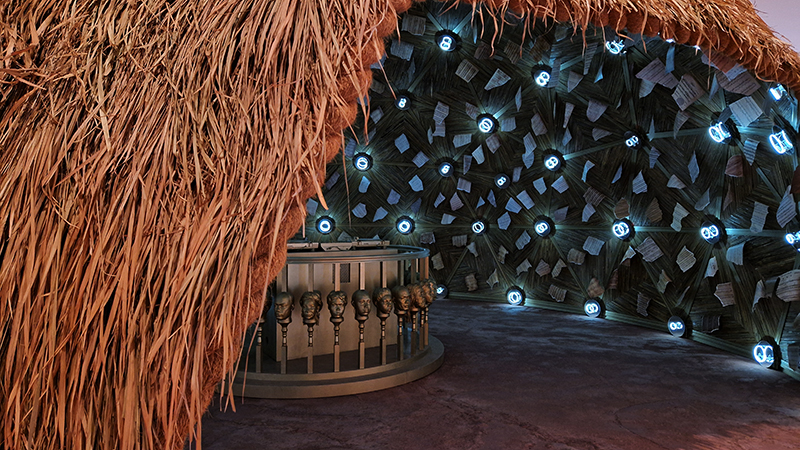 Deborah Tchoudjinoff’s video installation The City of Gold takes a speculative look at Earth in the far future. Her work considers vast, beyond human, geological timescales where continents have once again become one. Past supercontinents create room to speculate upon future ones if we understand Earth as shifting, moving matter. Starting as a short fiction text Tchoudjinoff began to form an imagined world of cities in a future supercontinent of Amasia. The fictional cities named after the minerals that are heavily sought – rare earths, copper, uranium, gold, and coal – hinting at the narrative of an Earth depleted of the resources we rely on. The City of Gold is one of five imagined cities.