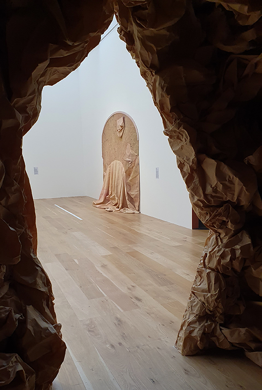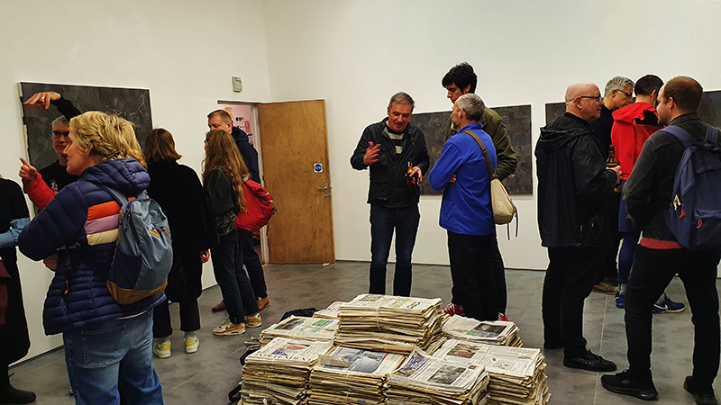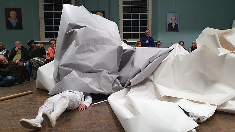 This sculpture also embodies the passage of time, and a layering of information, in the months of collecting paper donations or scavenging the recycling bins, weeks tearing down the hundreds of prints and drawings into squares decreasing by 1mm every 50 sheets, drilling holes through the centre and hours to build the almost 3m stack. I’m very grateful to everyone who donated some of their work archive. These images are now secreted within the layers of the sculpture, hinted at where edges are exposed, echoing the Earth’s sedimentary knowledge.