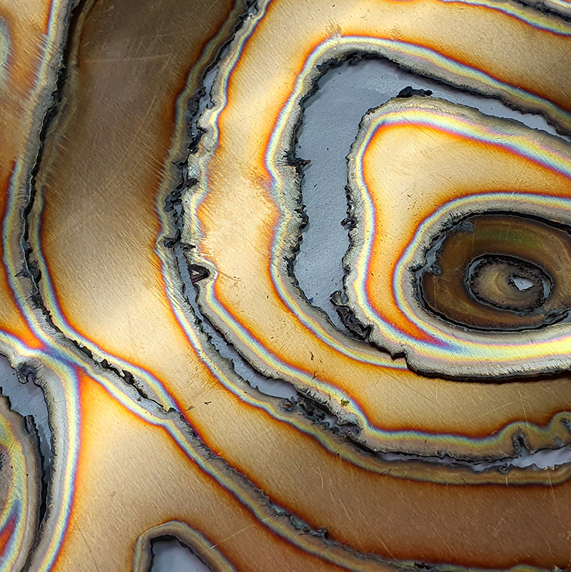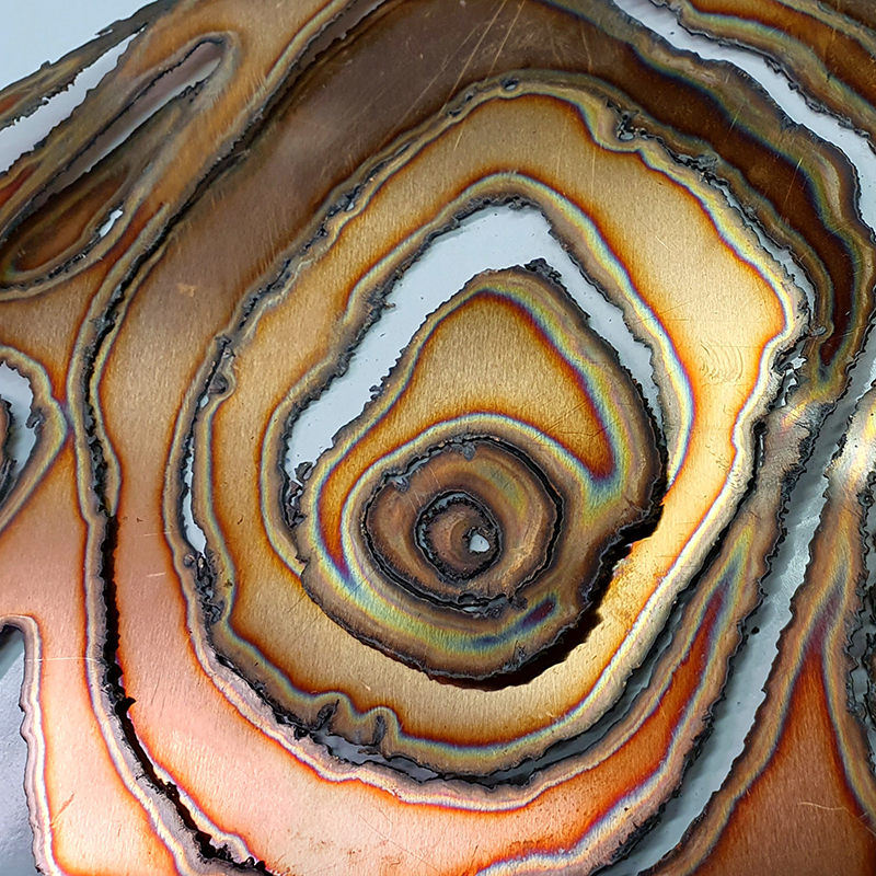I first came across directional magnetic steel in the Electronic & Magnetic Materials Group open day at the National Physical Laboratory. Intrigued, I wanted to know if I could get hold of some to work with. I was put in touch with Union Steel Products who were very helpful in supplying a small amount (to them) of the material, but they import the product, and it arrives with an indeterminate protective matt grey coating. This was my challenge. It took many days of sanding and gently etching each sheet to reveal the pattern. It was a very temperamental material to work with, the pattern might appear but quickly tarnish and muddy over. So much of the work in the resulting sculpture was about the process of exposing an internal mechanism.