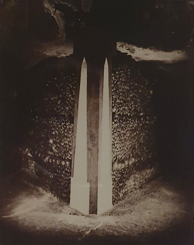 The Azimuth Obelisk (of sedimentary knowledge) Paper, steel, Snowcrete, oyster shells, patinated copper; 30 x 30 x 270 cm